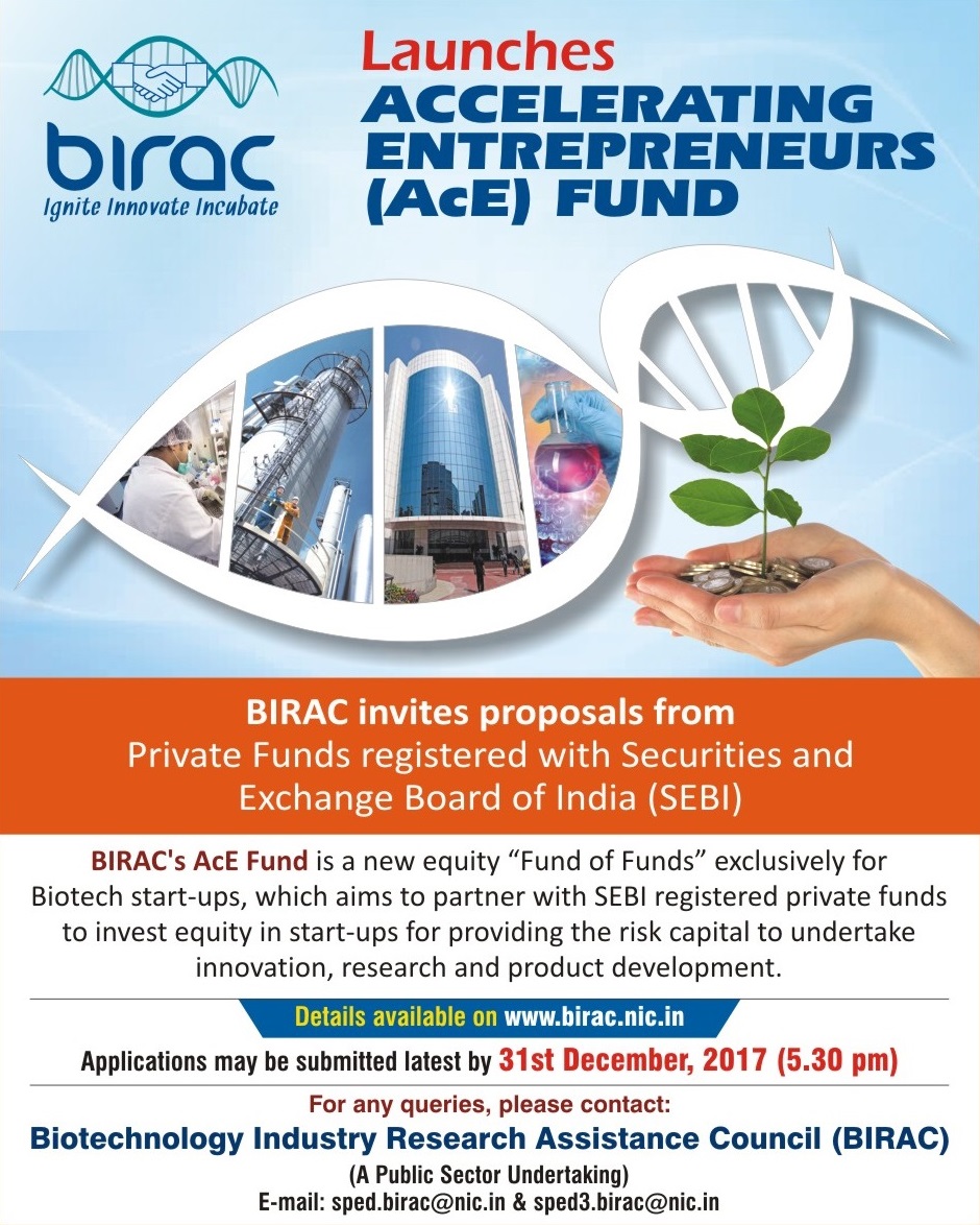 - The proposed BIRAC AcE (Accelerating Entrepreneurs) Fund (hereafter referred to as “AcE Fund”) will , operate as “Fund of Funds” to foster R&D and innovation in Biotechnology domains (including areas such as healthcare, pharma, medical devices, agriculture, sanitation to name a few). AcE Fund shall invest in and partner with SEBI-registered AIFs (i.e. Venture Funds and Angel Funds). It is intended that the AcE Fund plugs the gap of the “Valley of Death “encountered by the Biotech start-ups during their product development cycle and growth phase.
