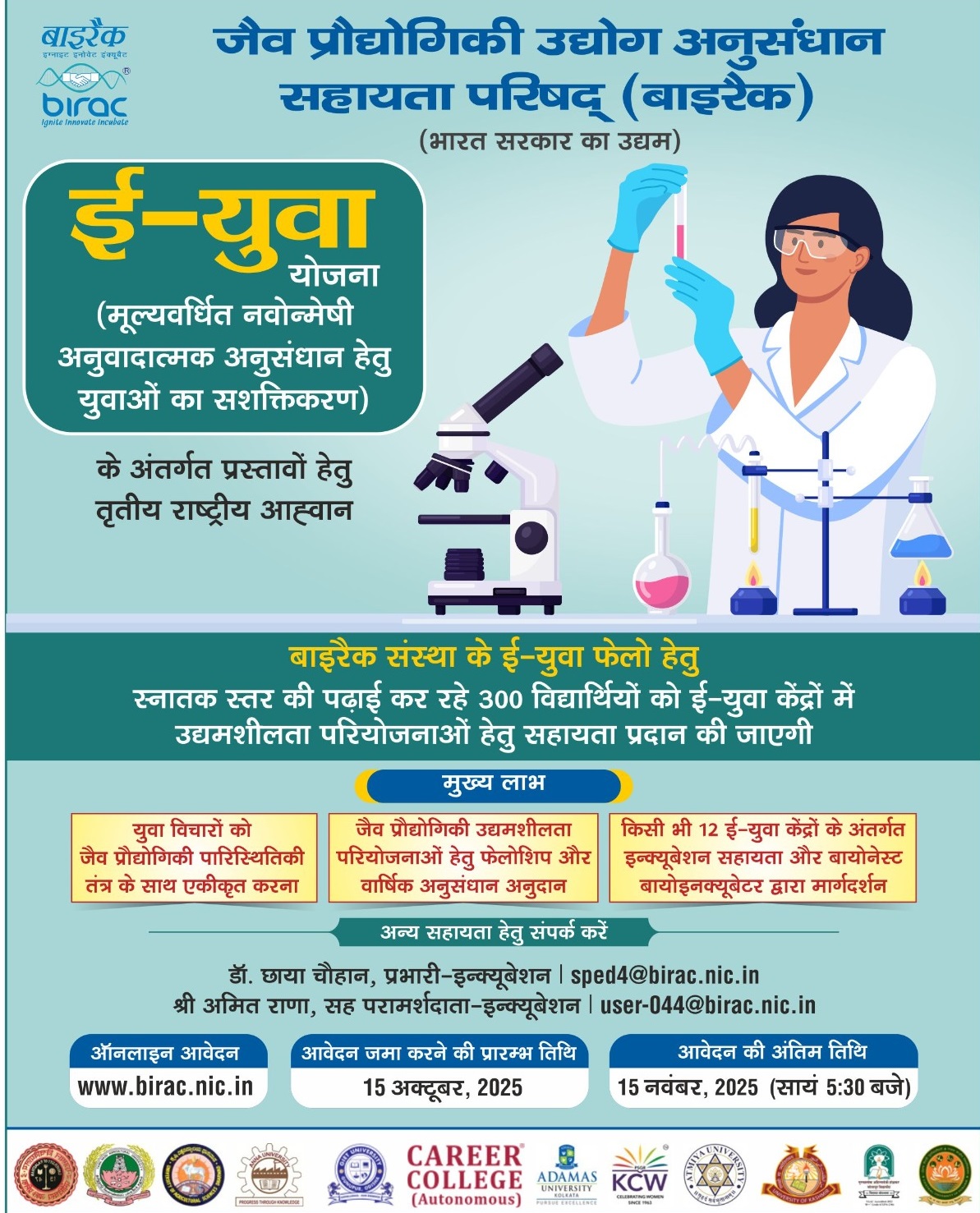 बीआईआरएसी द्वारा ई-युवा योजना के तहत बीआईआरएसी के ई-युवा फेलो के लिए तीसरे प्रस्ताव की घोषणा (आवेदन करने की अंतिम तिथि 15 दिसंबर, 2025 05:30 अपराह्न तक बढ़ा दी गई है)