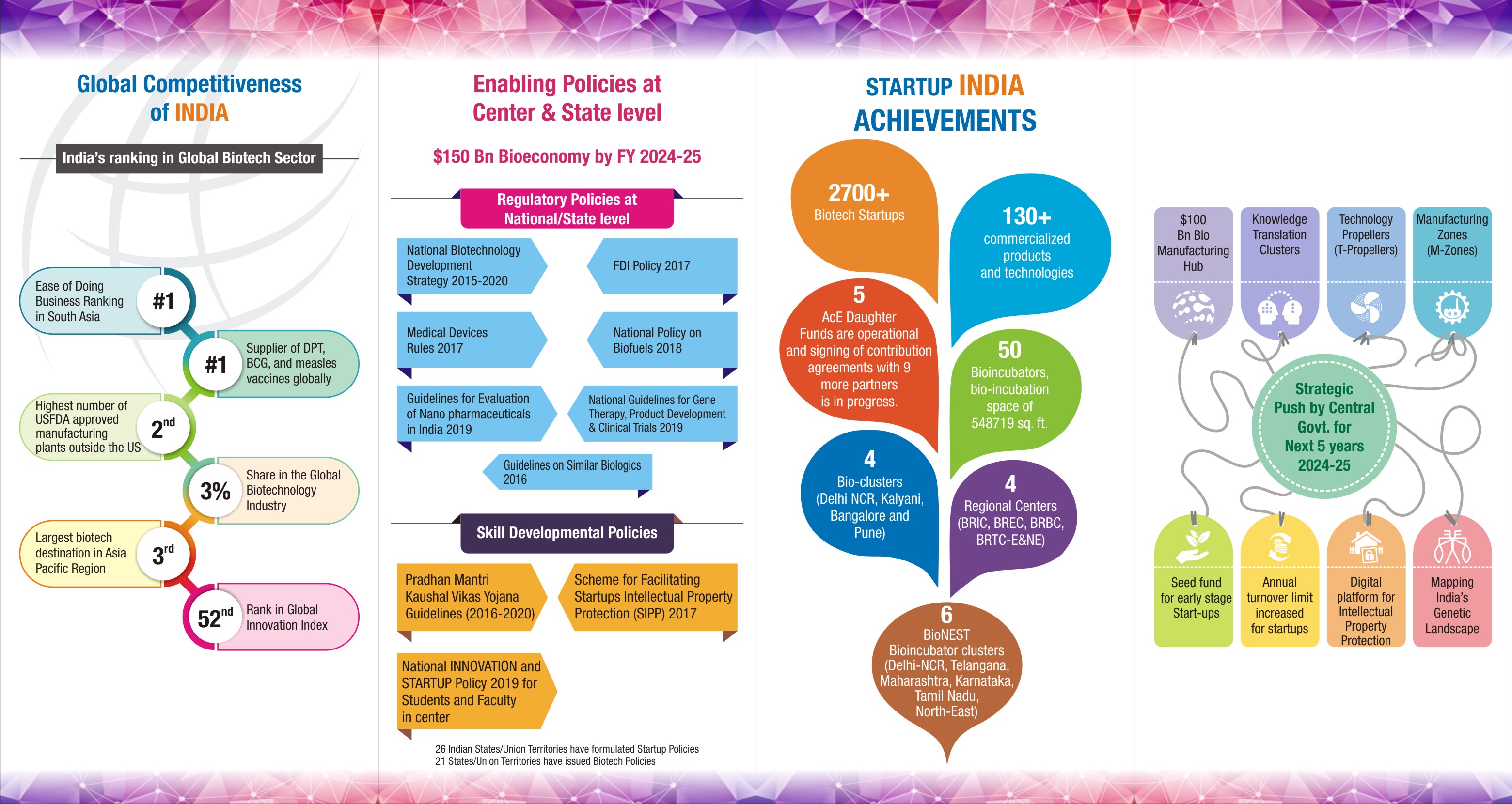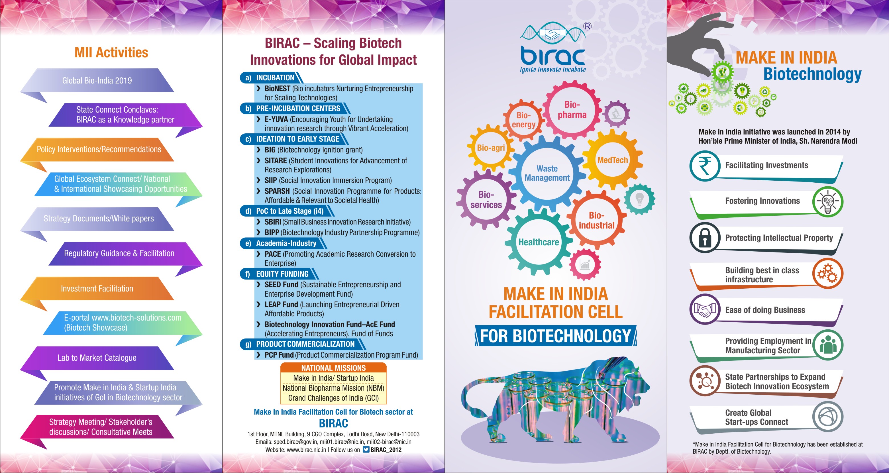Devised to transform India into a global innovation and manufacturing hub, GoI launched ‘Make In India’ program in September 2014. DBT recognizes the necessity for entrepreneurship development among the youth in the country and hence has taken initiatives to build, support and promote Indian biotech ecosystem in healthcare, agriculture and industrial biotechnology by delegating responsibility to its Public Sector Enterprise, Biotechnology Industry Research Assistance Council (BIRAC) to establish a Make in India Facilitation Cell for Biotechnology Sector in 2016 with the following mandate: